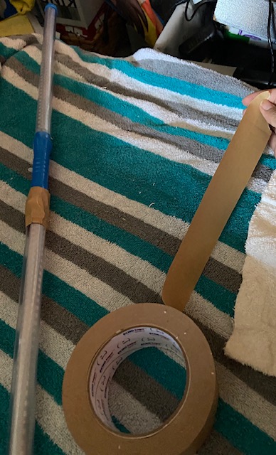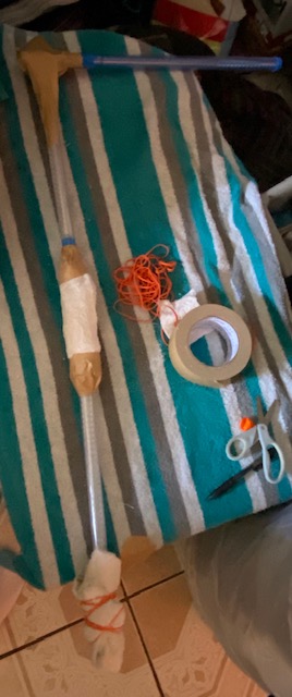 Now that your three sticks are attach to one another. You want to add the rag on areas in where you may be placing your hands for better grip. If your rag is big enough go ahead and cut it into half. Next use one half for the bottom part of your now flipped L stick. Use your rubber bands to tighten the rag onto the stick. I used about 5 rubber bands to keep it nice and sturdy. Finally, use the second half of the rag to place it on the middle of your flipped L stick because that may be another area where you may be touching constantly with your hands. On this area you want to use two pieces of tape, one on each end of the rag as seen in the pictures.