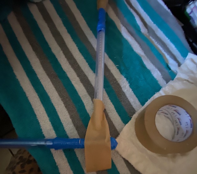 This oven pointer will be a great tool for teenagers, young adults and older adults who use a wheelchair. This tools helps reach the oven buttons which are normally found on high reaching points on top of the oven. It’s a tool that can be easily created in about 20 minutes or less. It costs less than $10 at the store and if you don’t want to spend money you can pick up items from home. For example if you do not have the same size sticks you can use clothe hangers, if you don’t have tape you can use hot glue and if you do not have an old rag you can use a sock.
